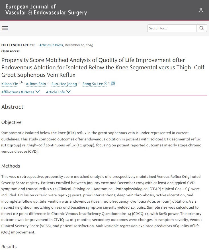 (2025)Propensity Score Matched Analysis of Quality of Life Improvement after Endovenous Ablation for Isolated Below the Knee Segmental versus Thigh–Calf Great Saphenous Vein Reflux