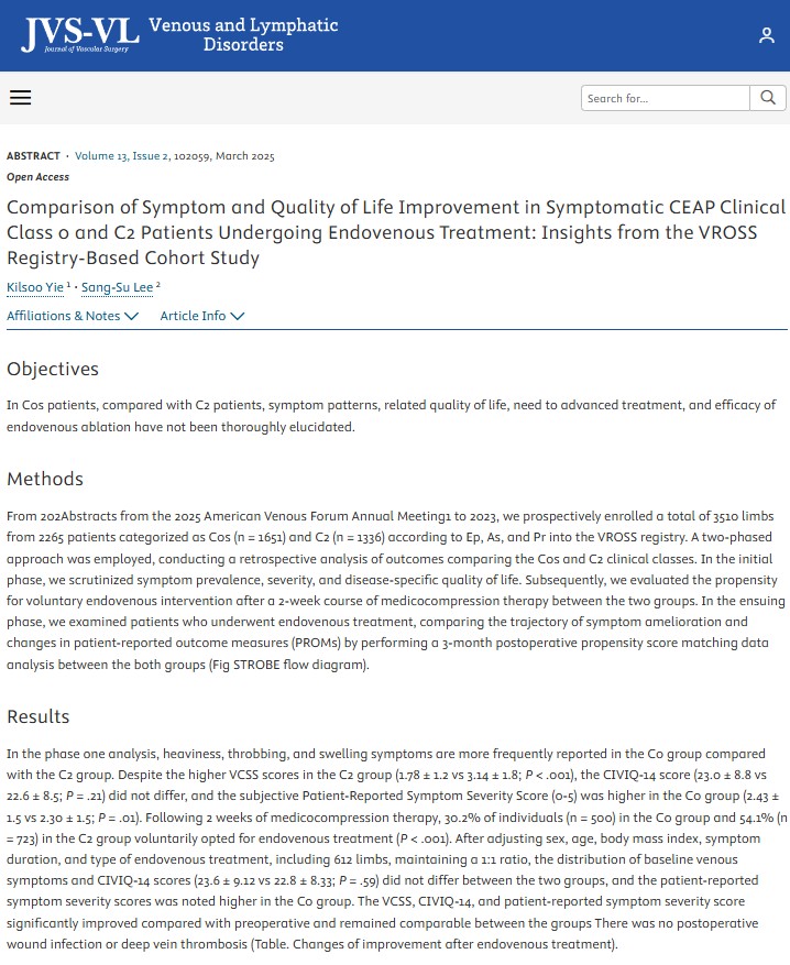 (2025)Comparison of Symptom and Quality of Life Improvement in Symptomatic CEAP Clinical Class 0 and C2 Patients Undergoing Endovenous Treatment: Insights from the VROSS Registry-Based Cohort Study.